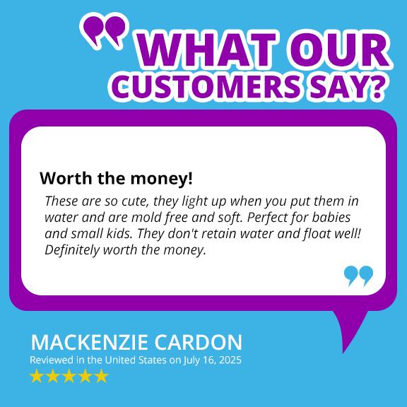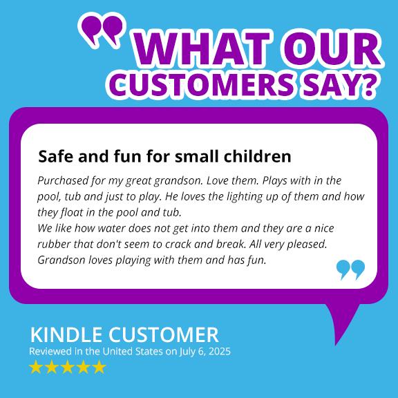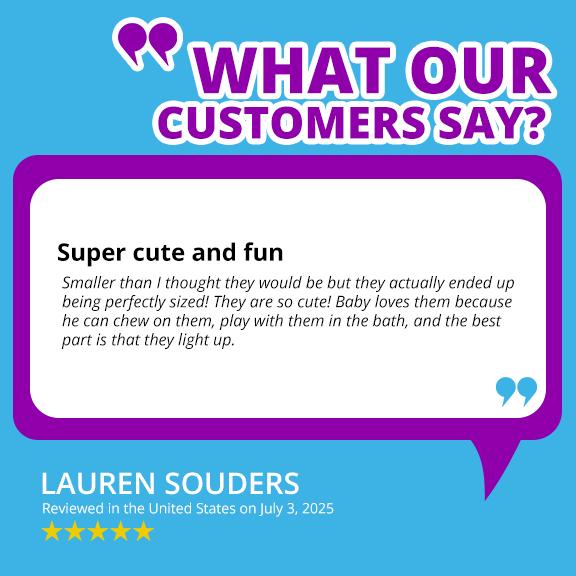 Water-safe lights, soft PVC, and are nontoxic, Phthalate-free & BPA-free. Batteries are securely sealed inside for a safe toddler bath. 💧