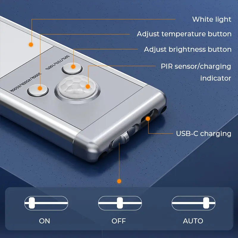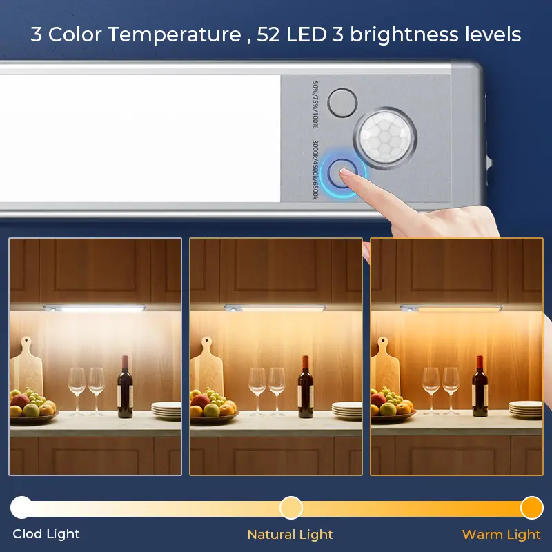 [Smart Motion Sensor] – These under cabinet lights turn on automatically when movement is detected within 10ft/120° in dark areas, and turn off after 18s of no motion. Perfect for night use in the kitchen, closet, hallway, or stairs[Dimmable Closet Lighting] – Features 76 bright LED beads with soft, eye-friendly light. Choose 25%/50%/75%/100% brightness or enjoy stepless dimming from 10–100% to match your needs.[Rechargeable & Wireless] – Built-in 1500mAh USB-C rechargeable battery. Long-lasting and eco-friendly, no need to keep buying batteries[Magnetic & Easy to Install] – Strong built-in magnets let you attach the light directly to any iron surface, or use the included adhesive plates to install anywhere. Easily remove for recharging.[Wide Application] – Ideal as under counter lighting, pantry light, wardrobe light, bookshelf light, or stair safety night light. Adds brightness and convenience anywhere in your home.[Perfect Gift Idea] – A practical and thoughtful gift for Thanksgiving, Christmas, Black Friday, Cyber Monday, or housewarming. Great for anyone who loves a cozy, well-lit home